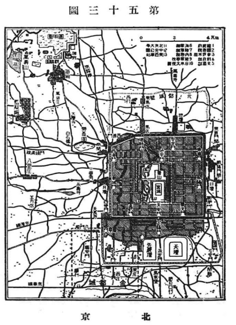 この大都の跡に明が都したとき、これをもって大に過ぐるとなし、城北五里を縮め東西両面の北方の門を廃した。