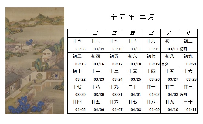 辛丑二月カレンダー です。