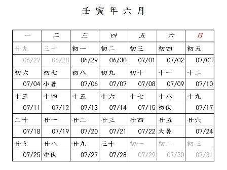 壬寅年六月カレンダーです。